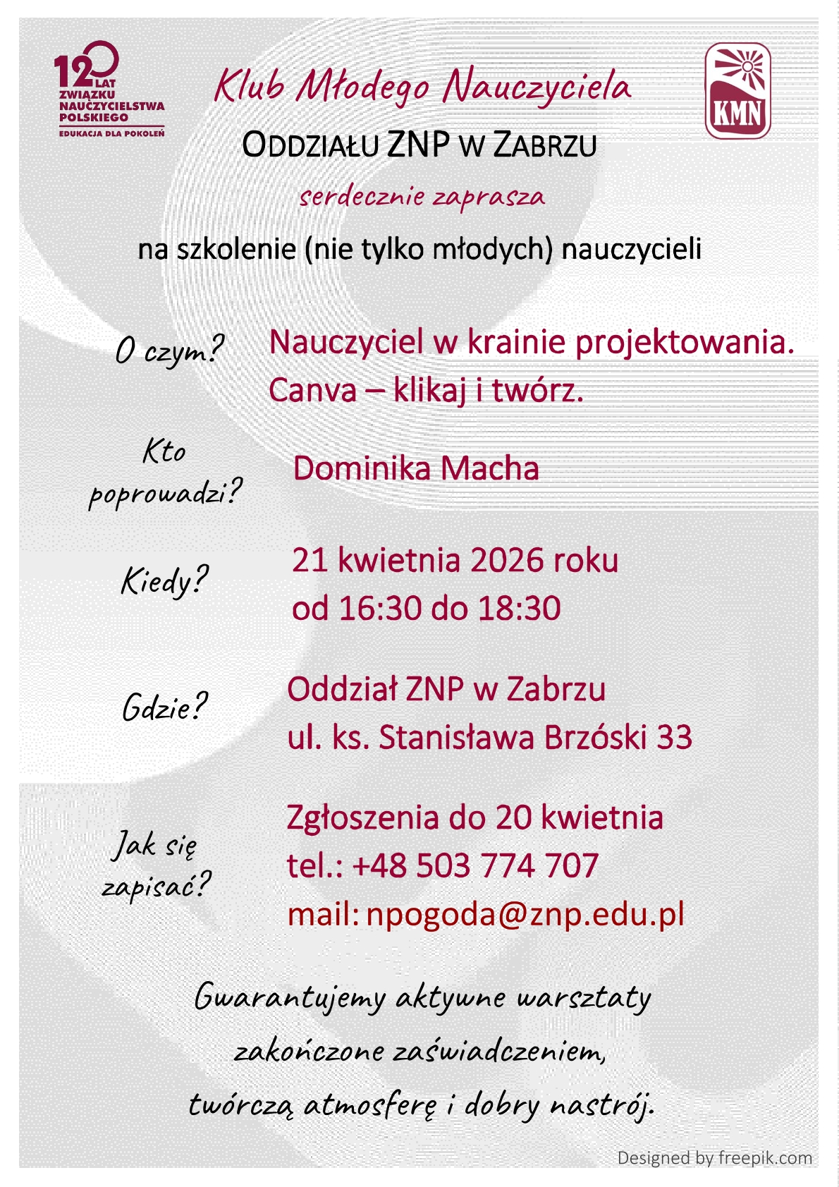 Niepubliczna Placówka Kształcenia Ustawicznego ZNP w Chorzowie zaprasza na szkolenie podstawowe w formie webinarium (online, MS Teams) skierowane do osób pełniących funkcję Zakładowego Społecznego Inspektora Pracy w placówce: „Zakładowy Społeczny Inspektor Pracy – szkolenie podstawowe” (18 godz. dydaktycznych) Termin: 19-20 marca 2026 r. (czwartek-piątek) w godz. 8:30 – 15:30 Koszt od uczestnika: 380 zł / 350 zł członkowie ZNP Zapisy […]
