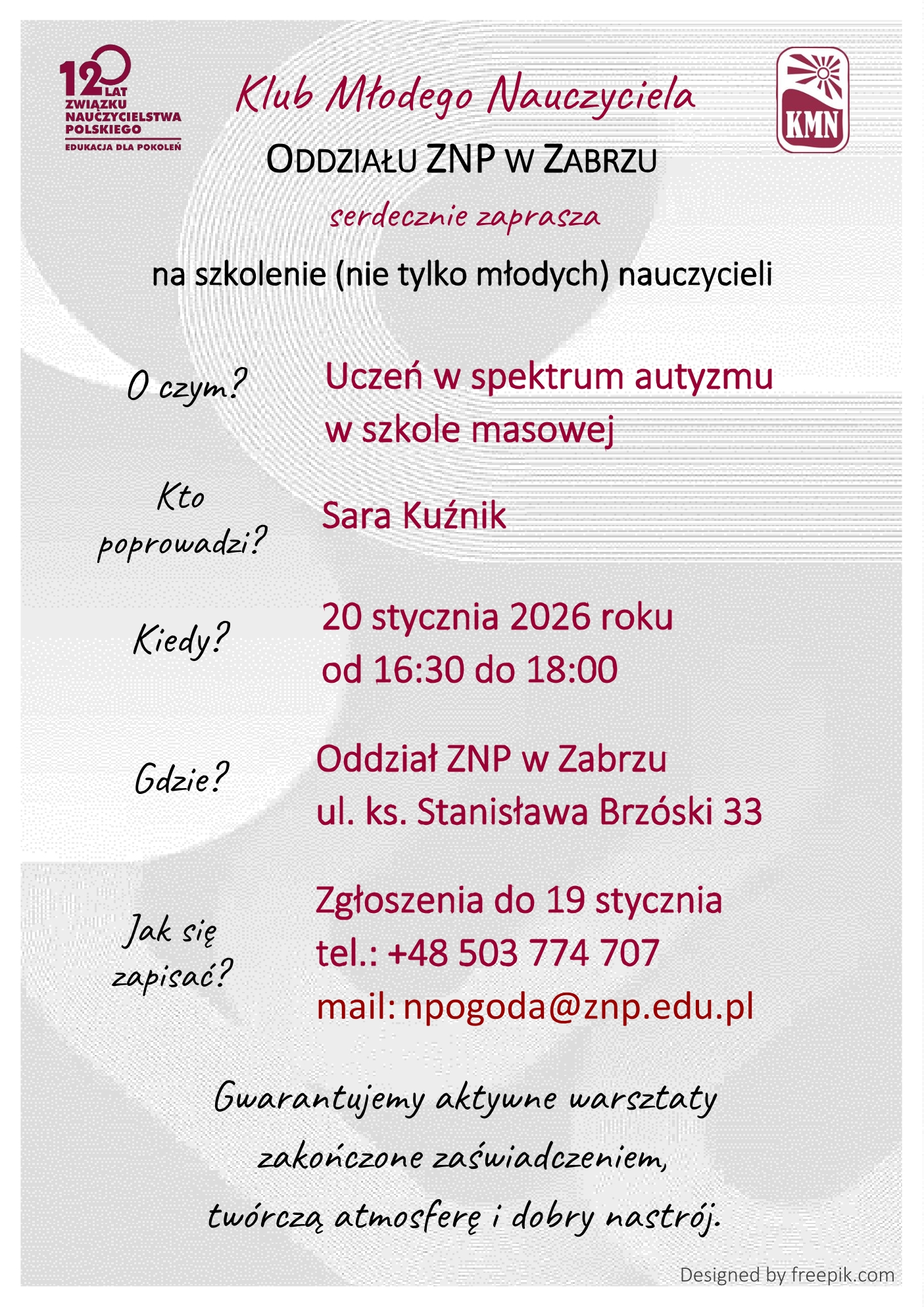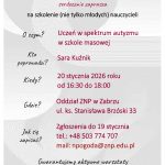 Klub Młodego Nauczyciela rozpoczął nowy rok z przytupem, czyli szkoleniem „Uczeń w spektrum autyzmu w szkole masowej”, które poprowadziła Sara Kuźnik. Podczas spotkania, które odbyło się 20 stycznia, poruszono zagadnienia dotyczące funkcjonowania uczniów w spektrum autyzmu, ich potrzeb edukacyjnych oraz skutecznych sposobów wspierania ich w codzienności szkolnej. Szkolenie przebiegało w bardzo dobrej, sprzyjającej współpracy atmosferze, umożliwiającej swobodną wymianę doświadczeń, refleksji oraz dobrych praktyk między uczestnikami. Zdobyta wiedza i wspólne wnioski pozwolą na jeszcze lepsze dostosowanie metod nauczania oraz budowanie przyjaznego i bezpiecznego środowiska edukacyjnego dla wszystkich uczniów.