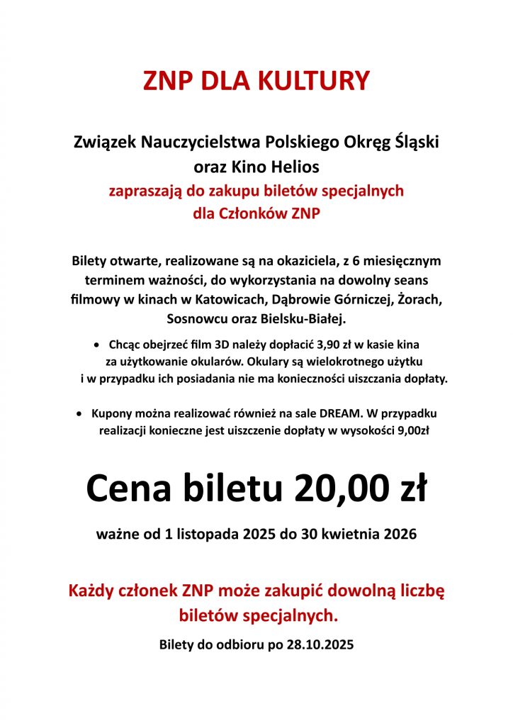 – > Bilety do Kina Helios – zgłoszenia wraz z wpłatami w biurze Oddziału do 9 października.