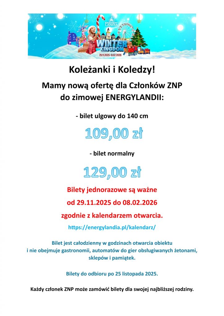 – > Energylandia zimowa – zgłoszenia wraz z wpłatami w biurze Oddziału do 31 października.